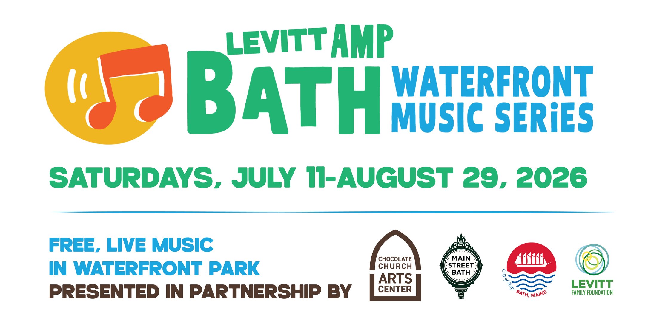 Levitt AMP Bath Waterfront Music SeriesMark your summer calendars for the FREE Levitt AMP Bath Waterfront Music Series, Saturdays in Waterfront Park, July 11 through August 29, 2026. Presented in partnership by the Chocolate Church Arts Center, Main Street Bath, and City of Bath, with support from the Levitt Family Foundation. These free, summer waterfront concerts are back in Bath thanks to all of the community members who voted for us last September to receive a Levitt AMP Music Series Grant! Learn more and preview the summer 2026 lineup at levittampbathmaine.org.